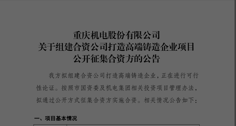 重慶機電股份有限公司關于組建合資公司打造高端鑄造企業項目公開征集合資方的公告我方拟組建合資公司打造..